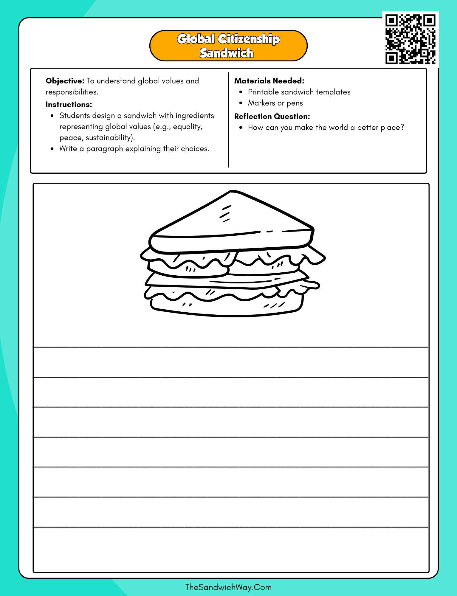 Inspire global responsibility with this creative worksheet. Students design sandwiches symbolizing values like peace, equality, and sustainability. Ideal for fifth grade and all young learners! - SEL (Social and emotional learning)