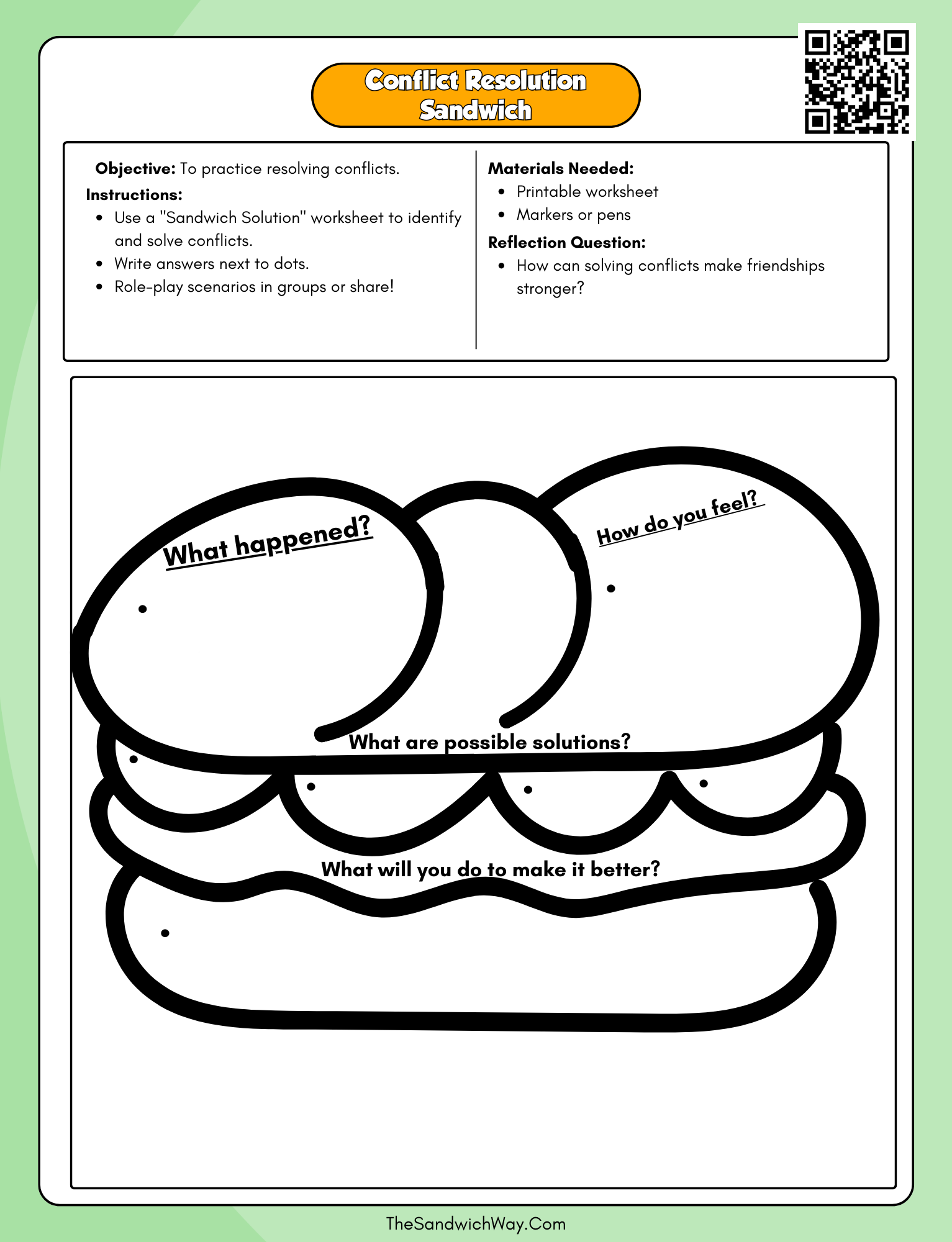 Teach third graders conflict resolution with this step-by-step 'Sandwich Solution' worksheet. Identify issues, brainstorm fixes, and role-play resolutions. Ideal for third grade and all young learners! - SEL (Social and emotional learning.)